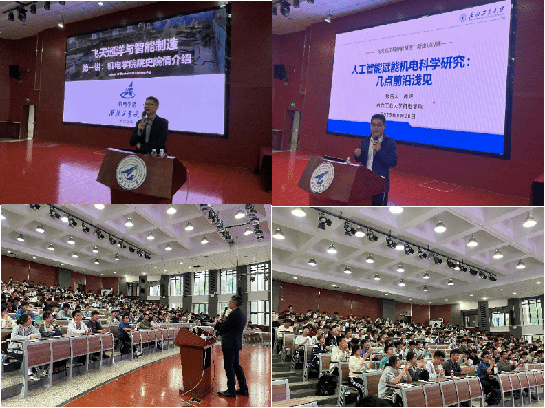 首先,机电学院院长常洪龙教授围绕“飞天巡洋与智能制造”主题,从院史院情、学院总师文化传承切入,深入阐述机电学院在人才培养方面的特色路径。他重点强调“机电管艺总师育人”的构建模式,如何培养学生具备机械力学基础扎实、电路控制知识牢固、管理协调能力突出、艺术美学素养兼备的复合型知识结构。同时用生动的案例介绍了机电学子“空天地海为国铸剑”来淬炼意志品质的能力提升路径。最后,常院长提出学院“百年百位中国飞行器总制造师”的宏伟愿景,勉励同学们好好学习,为国铸剑。精彩的讲述引发了同学们的强烈共鸣,教室内多次响起热烈掌声。