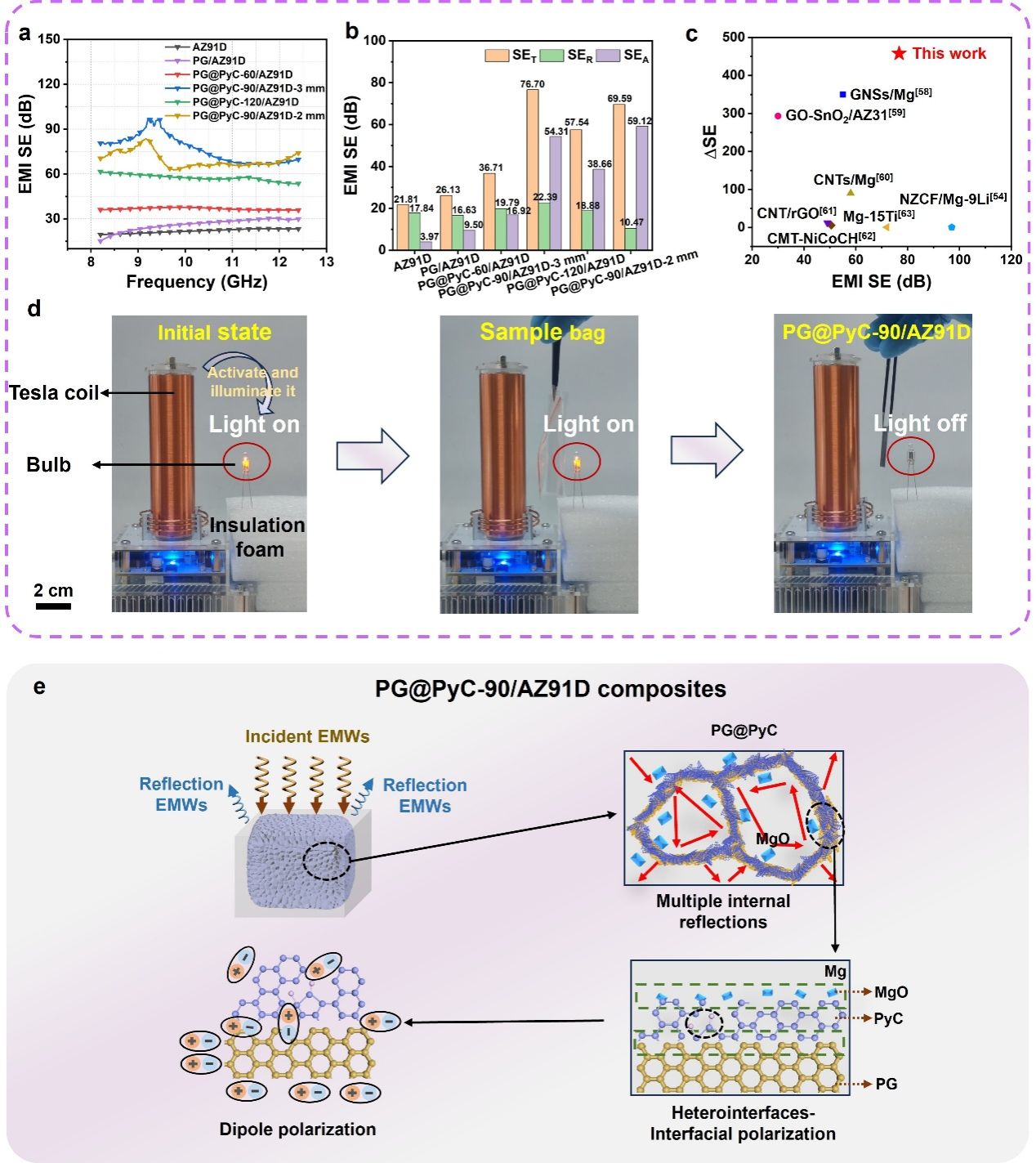 文章创造性地提出了一种“3D骨架预构建-浸渗填充”的新策略。首先采用气泡诱导自组装法构建三维网络结构本征石墨烯(PG)预制体;然后在PG表面原位生长热解碳(PyC)以提升预制体的骨架强度,可以抵御复合材料制备过程中熔融镁合金的浸渗压力;最后采用液固浸渗挤压法消除石墨烯-镁基体之间的界面缺陷,复合材料中仍保留预制体的三维连通骨架结构(图1)。石墨烯-镁基体界面处构筑的PyC-MgO纳米界面相显著提升了石墨烯和镁合金之间的力-电传输效率。在三维连通PG@PyC传导网络、PyC-MgO纳米异质界面等共同作用下,液固浸渗挤压法制备的三维连通石墨烯增强镁基复合材料实现了电磁屏蔽与力学性能的协同提升,电磁屏蔽效能高达76.70 dB(图2),抗压强度与未沉积PyC的复合材料相比提升了58.62%。复合材料在保证具有一定力学性能的基础上具有优异的电磁屏蔽性能,展现出优异的综合性能与应用潜力,有望为新一代航空航天飞机、卫星、雷达等电子元件在复杂严苛环境下稳定运行,提供新的技术路径。