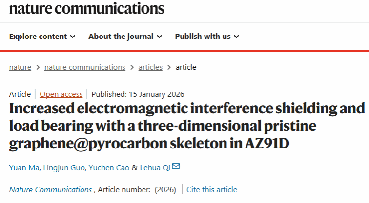 齐乐华教授为通讯作者、材料学院博士生马媛为第一作者的文章《Increased electromagnetic interference shielding and load bearing with a three-dimensional pristine graphene@pyrocarbon skeleton in AZ91D》在Nature子刊《Nature Communications》上发表。该文报道了团队在石墨烯增强镁基复合材料电磁屏蔽-力学性能研究方面取得的新进展。