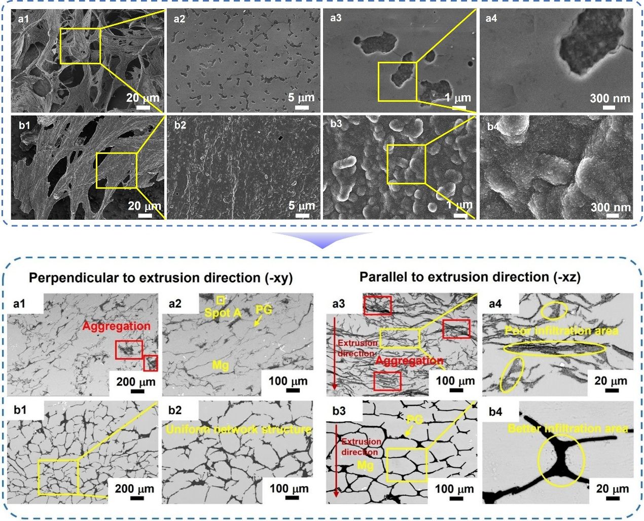图1 PG和PG@PyC预制体,PG/AZ91D和PG@PyC/AZ91D复合材料的微观形貌
