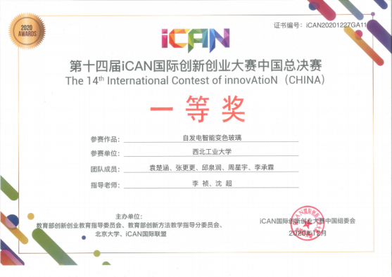 荣获一等奖的“自发电智能变色玻璃”团队由玛丽女王学院本科生袁楚涵、材料学院张更更等组成。作品主要由透明光伏电池、电致变色玻璃、集成系统三大核心技术构成,团队采用液相法制备钙钛矿透明太阳能电池以吸收紫外光发电并降低辐射,不断创新优化大面积电致变色玻璃的制备及封装方法,提高反应速度,增大可见光调节范围。集成智能电路系统实现了兼具高透明度、自供电、智能感知以及远程调控功能的新型节能智能玻璃,解决了传统调光玻璃能量耗散大,家装布线复杂的难题,市场应用前景广阔。