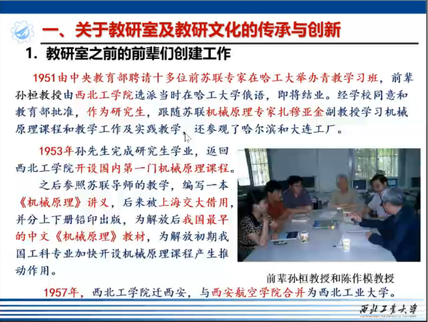 机械原理与机械零件教研室是国内机械工程教育的一面旗帜,葛文杰教授继承机械基础课程教学的杰出代表和改革引领者孙桓教授和濮良贵教授的传统,并予以发扬创新。未来希望本教研室能够持续提升机械基础课程教学质量,引领全国机械基础课程教学改革航向,探索研究型和应用性大学机械系列课改革,做到高水平教学成果的示范辐射。