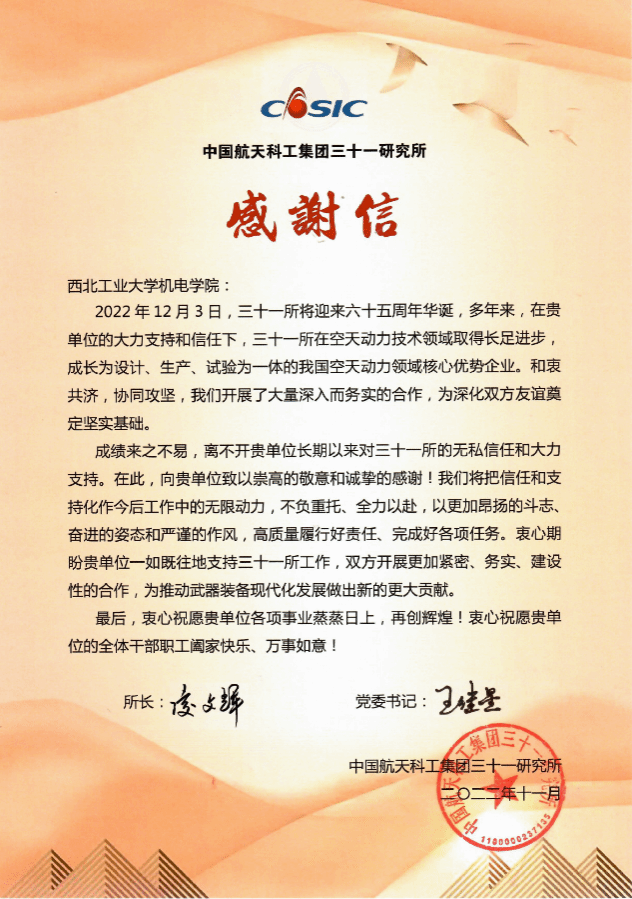 张卫红院士研究团队收到了来自中国航天科工集团三十一所,署有凌文辉所长和王继星书记亲笔签名的感谢信。这不仅是对污污漫画
