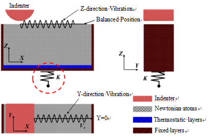 佟瑞庭团队提出采用微重力环境机构运动行为模拟代替微重力环境模拟,建立了硅基纳米器件碰撞滑动接触分子动力学模型(图3所示),研究了压头不同振动频率、振幅以及基体纹理表面等对碰撞滑动接触过程中平均摩擦力的影响。研究表明碰撞滑动接触平均摩擦力表现出明显的频率依赖性;在一定工况下,增大压头振幅导致了基体表面温度的升高以及基体晶格结构的破坏,显著降低了平均摩擦力。此外,研究发现碰撞滑动接触工况下纹理表面依然具备较好的减摩效果,纹理表面降低了压头与基体之间的实际接触面积,使得基体表面更容易向着压头滑动的方向变形,减小了压头滑动所受阻力,有效降低了碰撞滑动接触过程中的平均摩擦力。