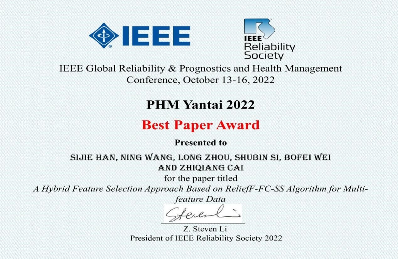 蔡志强教授课题组通过特征选择的方式从海量原始数据中获取重大装备故障诊断有效信息,相关成果《A Hybrid Feature Selection Approach Based on ReliefF-FC-SS Algorithm for Multi-feature Data》被13th IEEE Global Reliability & Prognostics and Health Management Conference(PHM)国际顶级会议录用并荣获“Best Paper Award”。该会议由IEEE可靠性协会提供赞助和支持,致力于提高机械装备和产品的可靠性、可用性、系统安全性和维护性。会议涉及航空航天和军事系统、电子设备、制造工艺、云计算和核动力等各个研究领域,汇集学术、工程和管理学科的世界级专家,为学术思想交流提供了一个重要的跨学科交流平台。论文第一作者是污污漫画