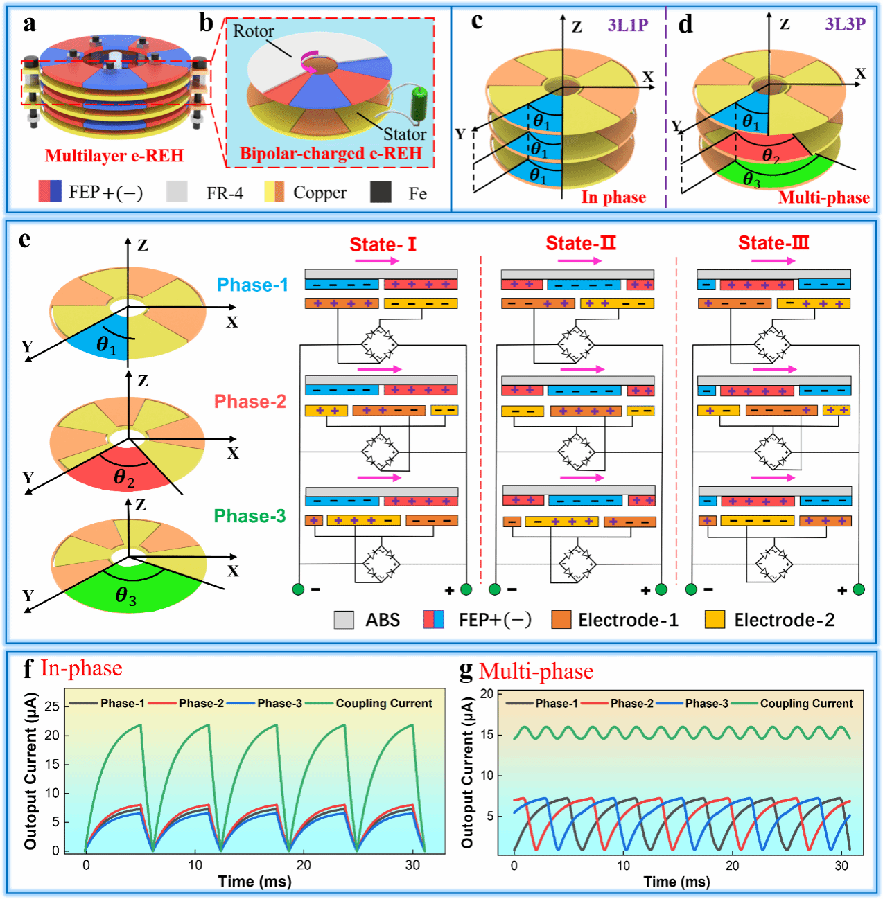 图3. (a-b) 空间多层发电模块; (c)同相位模式; (d)多相位模式; (e)多相位模式下静电发电原理; (f)同相位模式下输出电流波形; (f)多相位模式下输出电流波形。
