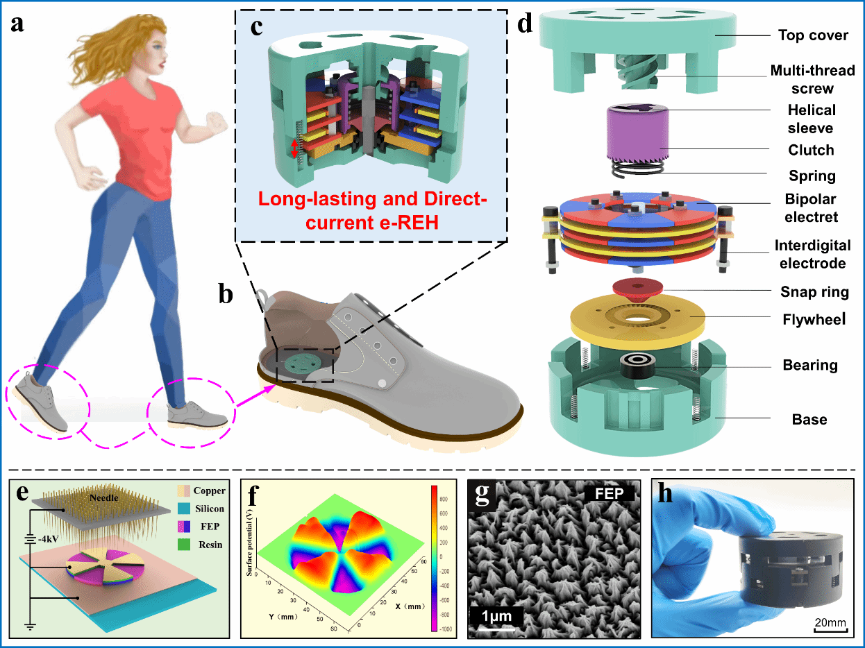 图1.(a-c)用于人体运动能量收集; (d)新型发电机爆炸结构体; (e-f)双极性驻极体充电连接方案和3D电势分布图;(g)驻极体表面结构SEM图;(h)发电机实物照片。