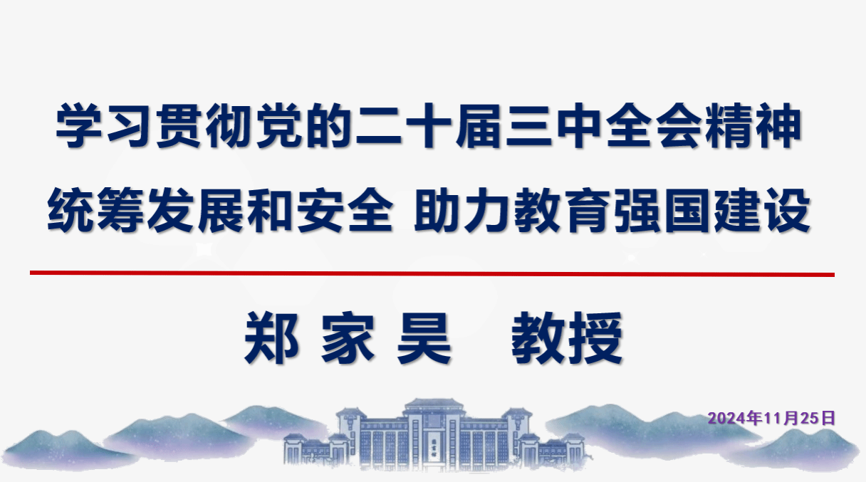 报告会上,郑家昊教授对党的二十届三中全会关于国家安全观的相关内容进行了深入剖析和讲解,介绍了近二十年来我国国家安全观念的发展历程,引领党员深刻理解党对国家安全的思路、理念和举措。郑教授通过多个深刻的警示案例分享让同志们认识到安全意识需要时时刻刻谨记在心,在日常工作和生活中要坚持底线思维和极限思维。同时细致讲解了教育强国理念政策,提醒广大党员要全面贯彻党的教育方针,坚持以人民为中心发展教育,主动超前布局、有力应对变局、奋力开拓新局,加快推进教育现代化,以教育之力厚植人民幸福之本,以教育之强夯实国家富强之基,为全面推进中华民族伟大复兴提供有力支撑。该报告会为激励教师党员奋发上进,扎实推进学校“127”目标提供了积极的帮助作用。