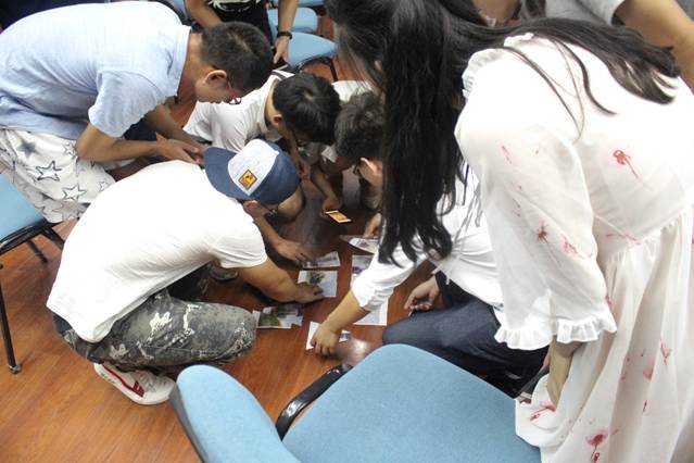 之后便是组队环节。研二的学长们别出心裁的在新生们坐的每张椅子下面都贴有一小张残画,几张残画拼在一起就组成一副完整的图画。可以组成一张画的新生们便组成一个小组。通过这个方式,萌新们就分成了六个小组。小组内的成员们互相介绍自己,在很短的时间内就打成了一片。