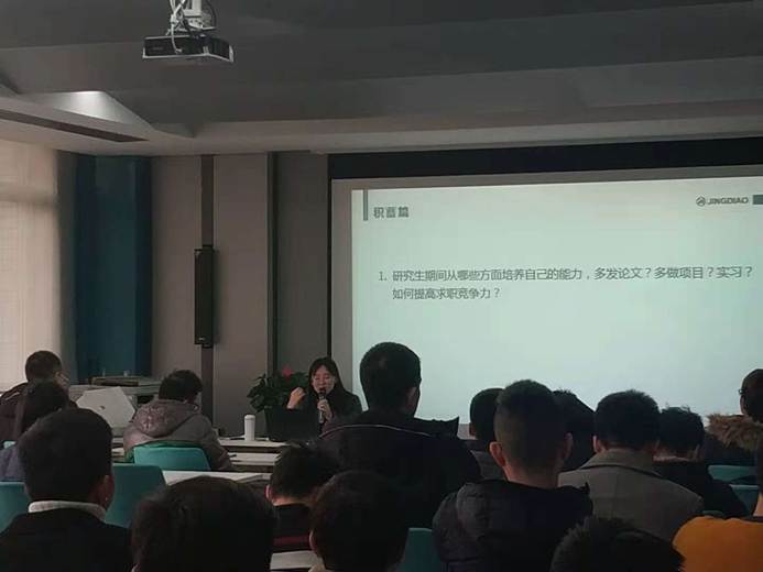 然后钱经理针对提前收集的同学们求职面试过程中可能遇到的问题进行了细致的分析并给出了各种应对策略。同学们所提出的问题第一大类是有关求职面试前自身的能力积蓄方面,对于研究生期间应该从哪些方面培养自己的能力,钱经理诚恳的告诉同学们要提高求职竞争力,首先要明确自己的求职目标,然后从这个目标出发培养自己的能力。