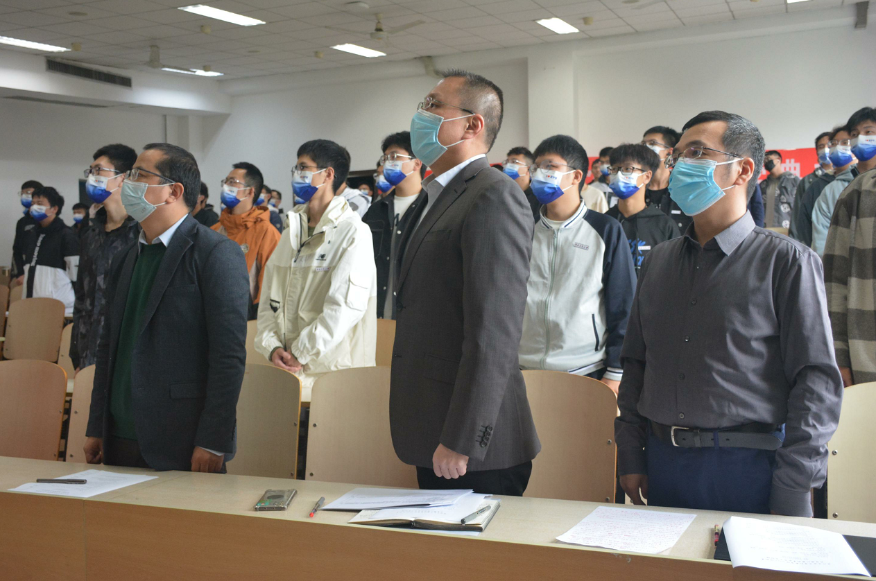 其次,党委书记张映锋致辞并对同学们进行了思想政治和理想信念教育,希望同学们将自我与时代和国家紧密结合,坚定信念,与时代共舞,承担起国家的脊梁,不负使命。