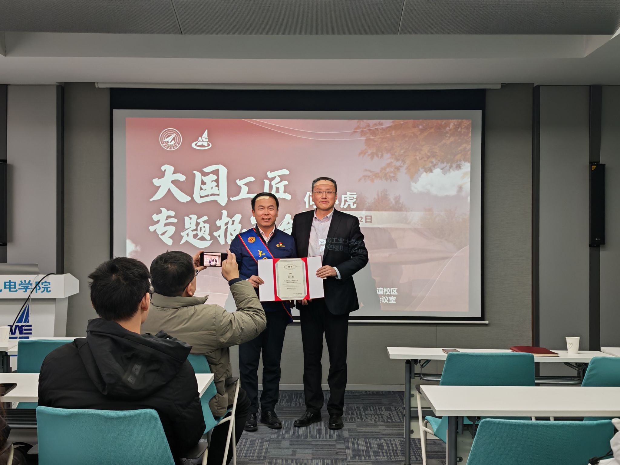 报告会上,何小虎以“技艺成长与匠心铸就”为题,结合自身求学、专业实践到成为“大国工匠”的奋斗经历。从勤学苦练、勇于创新、精益求精、投身航宇等方面介绍了技能成长路径和工匠精神品格。