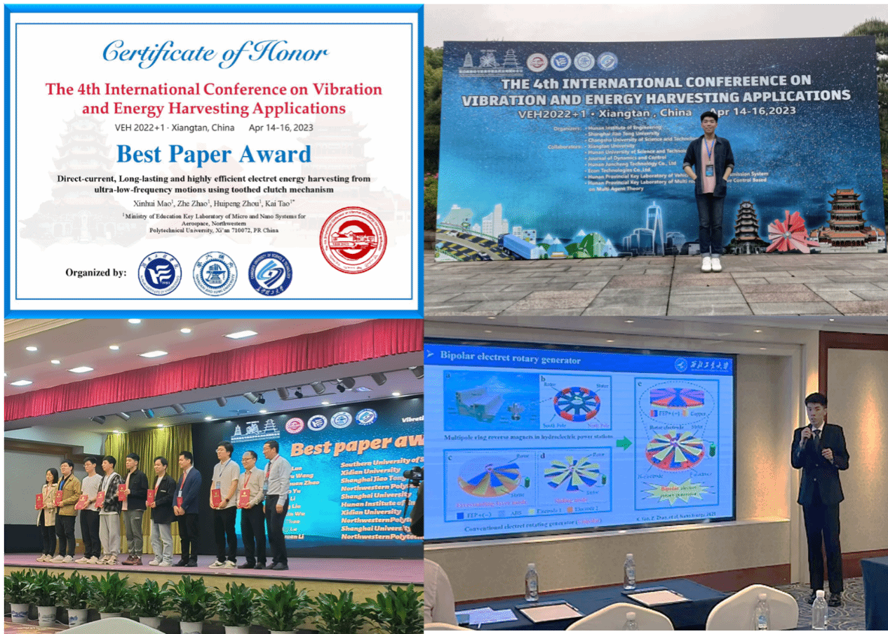 值得注意的是,在2023年4月湖南省湘潭市举办的VEH 2023大会上,毛新辉同学做了题为“Direct-current, Long-lasting and highly efficient electret energy harvesting from ultra-low-frequency motions using toothed clutch mechanism”的口头报告并获“VEH 2023最佳论文奖”,此次再度获奖,实现此奖项的蝉联。