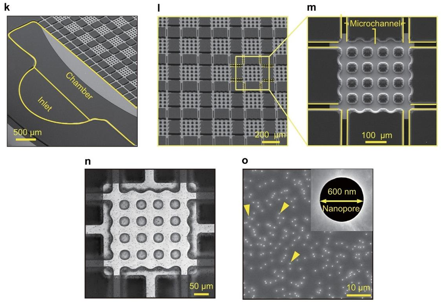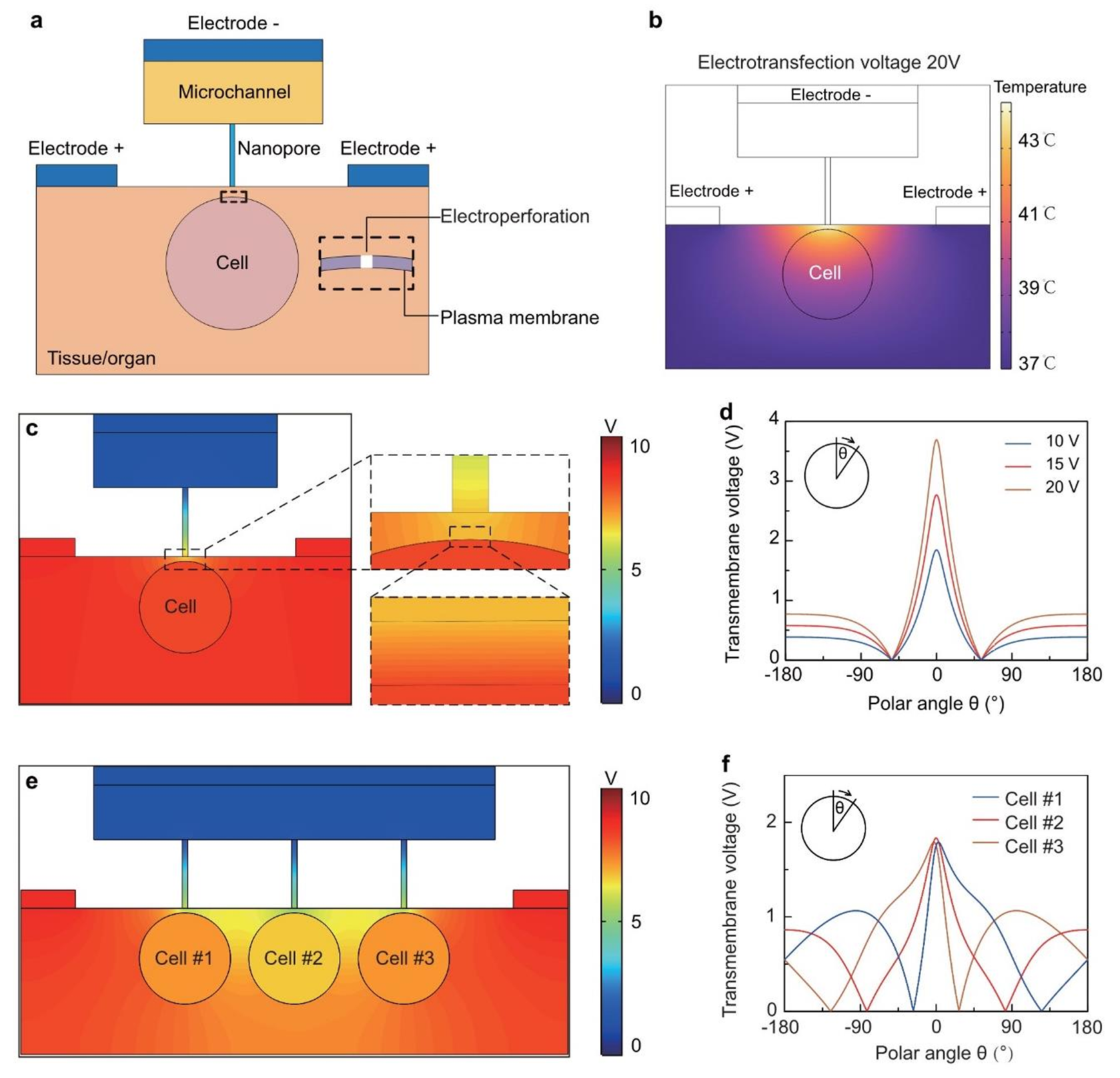 郝永存副研究员与常洪龙教授在柔性电子贴片的设计及制造方面开展深入研究,成功建立了“纳米孔-微通道-微电极”三维结构的电学、热学及力学模型(图 2),有力证明了纳米孔通道能够安全、高效且精确地在细胞膜上穿孔;攻克了聚合物-金属多层微纳结构制造技术难关,并依托污污漫画