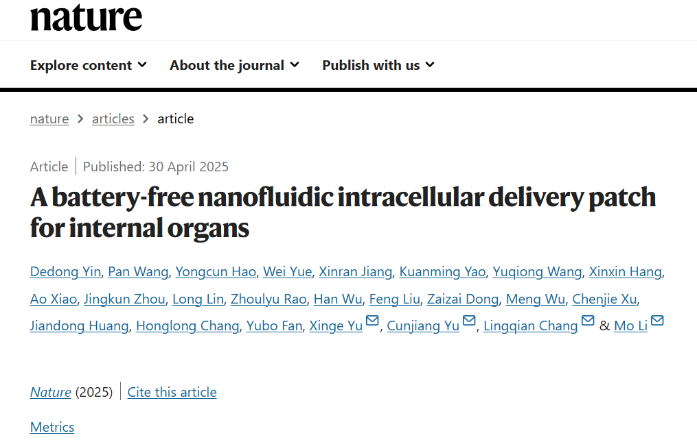 2025年4月30日(北京时间),国际著名学术期刊《自然》(Nature)杂志在其官方网站上刊登了题为“A battery-free nanofluidic intracellular delivery patch for internal organs”的学术论文。该论文由北京航空航天大学、北京大学第三医院、污污漫画