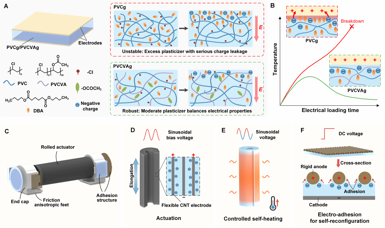 在本研究中,团队开发了一种具备低电压驱动、高电吸附力和可控自加热的新型聚氯乙烯基电活性聚合物。通过在聚氯乙烯凝胶中引入乙酸乙烯酯,有效抑制了因塑化剂迁移引起的发热与电击穿问题,同时显著提升了材料的介电性能与力学性能。与现有材料相比,新型材料的发热量降低超过50%,使用寿命延长15倍以上,输出力提升1.75倍,电吸附力提升2.15倍,在2 V/μm的低电场下即可实现30kPa的强吸附力,远优于传统静电吸附结构。此外,研究还提出多种电压控制策略,可实现材料的按需自加热或进一步发热抑制。