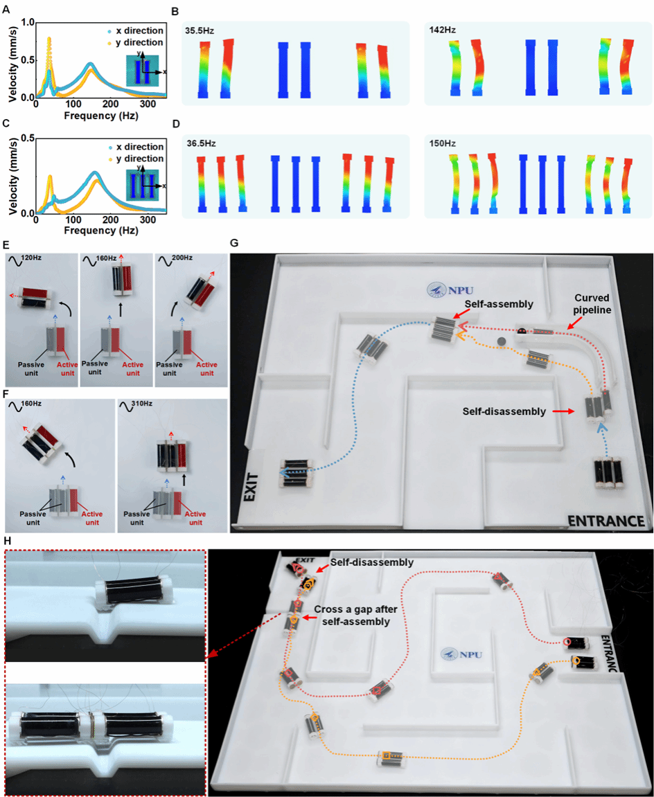 集群机器人的运动及自重构。(A-F) 集群机器人的动力学响应和运动;(G-H)复杂空间中机器人的自重构
