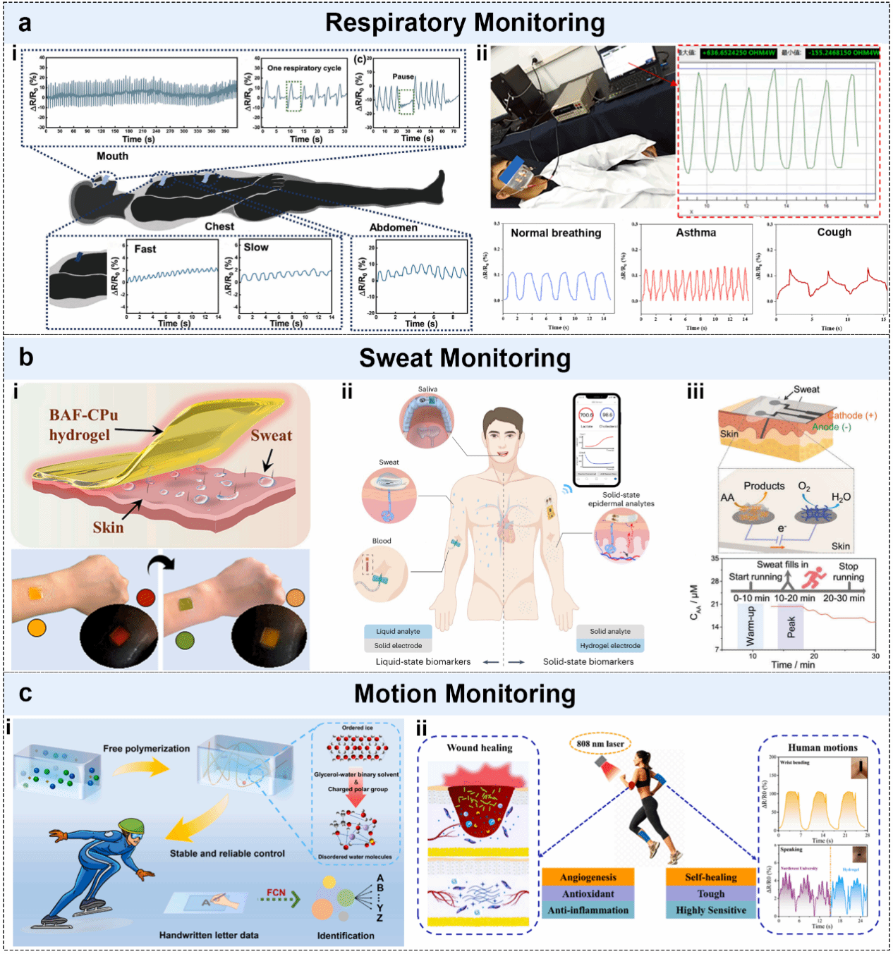图9. 自供能水凝胶传感器在健康监测中的应用。(a)呼吸监测:ⅰ)用于呼吸监测的水凝胶湿度传感器;ⅱ)非接触式呼吸监测;(b)汗液监测:ⅰ)汗液中尿素的无创检测;ⅱ)固态表皮生物标志物原位检测;ⅲ)自供电表皮汗液生物标志物监测;(c)运动监测:ⅰ)用于笔迹识别与深度运动监测的水凝胶应变传感器;ⅱ)多功能水凝胶运动监测传感及伤口愈合。