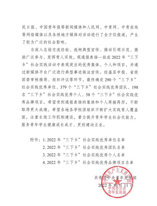 为深入总结交流经验,选树典型宣传,推动引领示范,激励广泛参与,发挥育人实效, 2022年10月12日,中国共产主义青年团中央委员会发文,通报表彰2022年全国大中专学生志愿者暑期文化科技卫生“三下乡”社会实践活动表彰结果。西北工业大学团委获评2022年“三下乡”社会实践优秀单位,西北工业大学“追火箭的年轻人”实践队获评2022年“三下乡”社会实践优秀团队。