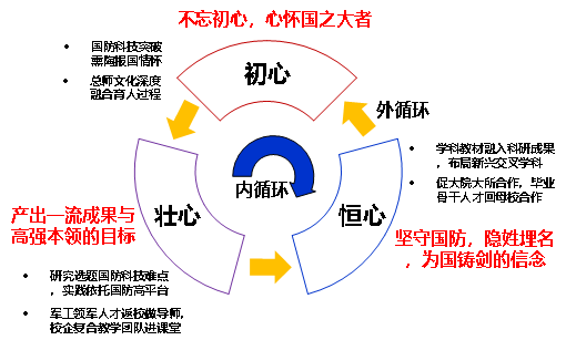 3)“育人需求内外循环”坚守学研融合、服务大国重器的恒心。内循环是学科教材融入科研成果,布局新兴交叉学科产出一流国防科技成果。外循环是积极与大院所合作,促进毕业后骨干人才与母校和导师合作,共同孵化国防科技大成果。