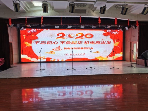 2020年1月11日下午,机电学院在健翔楼举办了一年一度的教职工迎新春联欢会,五楼多功能大厅大型LED屏上绚丽的显示出今年联欢会的主题是“不忘初心,不负韶华,机电再出发”。
