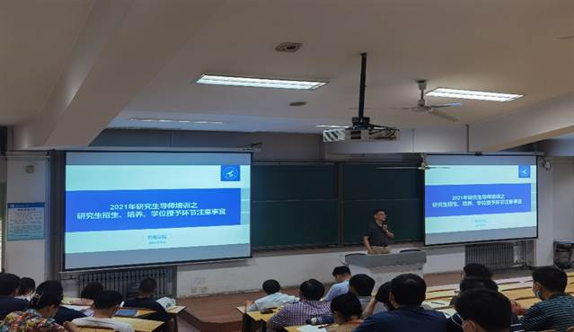 于7月2日上午11时,在西馆XB105召开2021年研究生导师培训大会。张映锋书记主持会议,朱继宏院长对于研究生教育工作的重要性和紧迫性进行了强调,常洪龙副院长对最新版的《研究生导师岗位管理相关文件解读》及《研究生招生、培养、学位授予》进行专题报告。