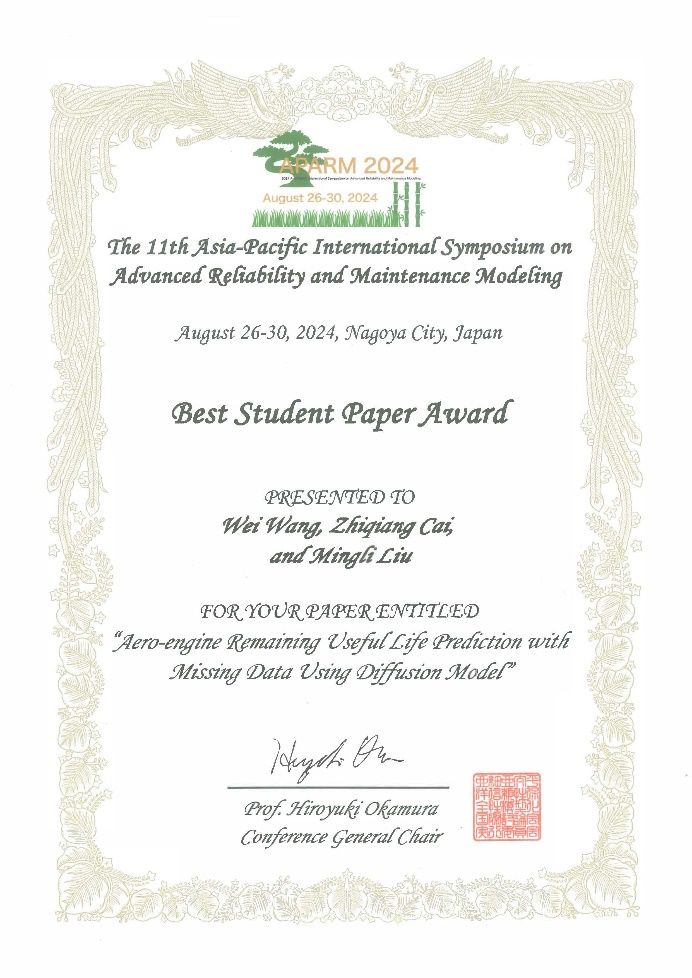 在此次会议上,机电学院蔡志强教授课题组荣获了APARM 2024最佳学生论文奖。获奖论文题为《Aero-engine Remaining Useful Life Prediction with Missing Data Using Diffusion Model》。该论文聚焦于航空发动机状态监测数据缺失对深度学习模型预测精度的影响,提出了一种名为DiffFMD的创新数据填充方法。通过有效填补数据缺失,这一方法显著提升了剩余使用寿命预测的准确性,展现了该课题组在复杂系统可靠性研究方面的重要进展。
