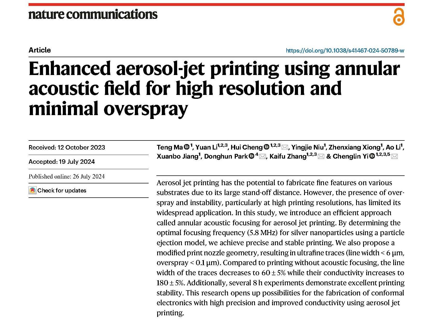 近日,西北工业大学张开富教授团队在气溶胶喷墨打印方向取得了新进展,成功发展了外加声场辅助聚焦的超高精度气溶胶喷墨共形打印策略,突破了行业的极限分辨率,在高精度、高集成共形电子制造领域具有重要应用潜力,研究成果以“Enhanced aerosol-jet printing using annular acoustic field for high resolution and minimal overspray”为题发表在Nature Communications(2024, 15, 6317)上。论文第一作者为博士研究生马腾,通讯作者为张开富教授、程晖教授和易城林教授。原文链接://doi.org/10.1038/s41467-024-50789-w