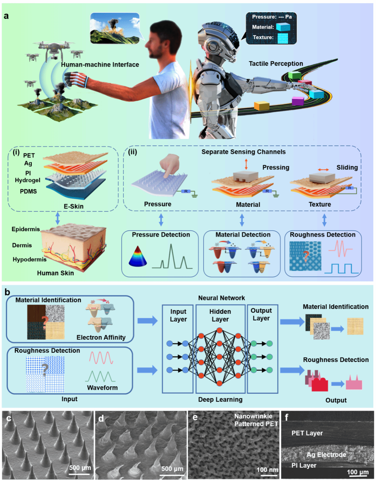 机电学院陶凯课题组提出了一种基于图案化水凝胶材料的多功能仿生电子皮肤(BHES),如图1所示。为模仿表皮层表面并更好地利用摩擦起电机制,引入了纳米褶皱图案化PET。同时采用微针图案化水凝胶作为摩擦层和导电电极,以提高器件的灵敏度。该电子皮肤具备高灵敏度压力传感、高准确率材料种类以及表面粗糙度识别等多种功能。结合信号采集/处理电路,可以通过该电子皮肤对人的手势进行检测,并用于进行无人机的三自由度运动操控以及无人机群的运动控制(图1)。