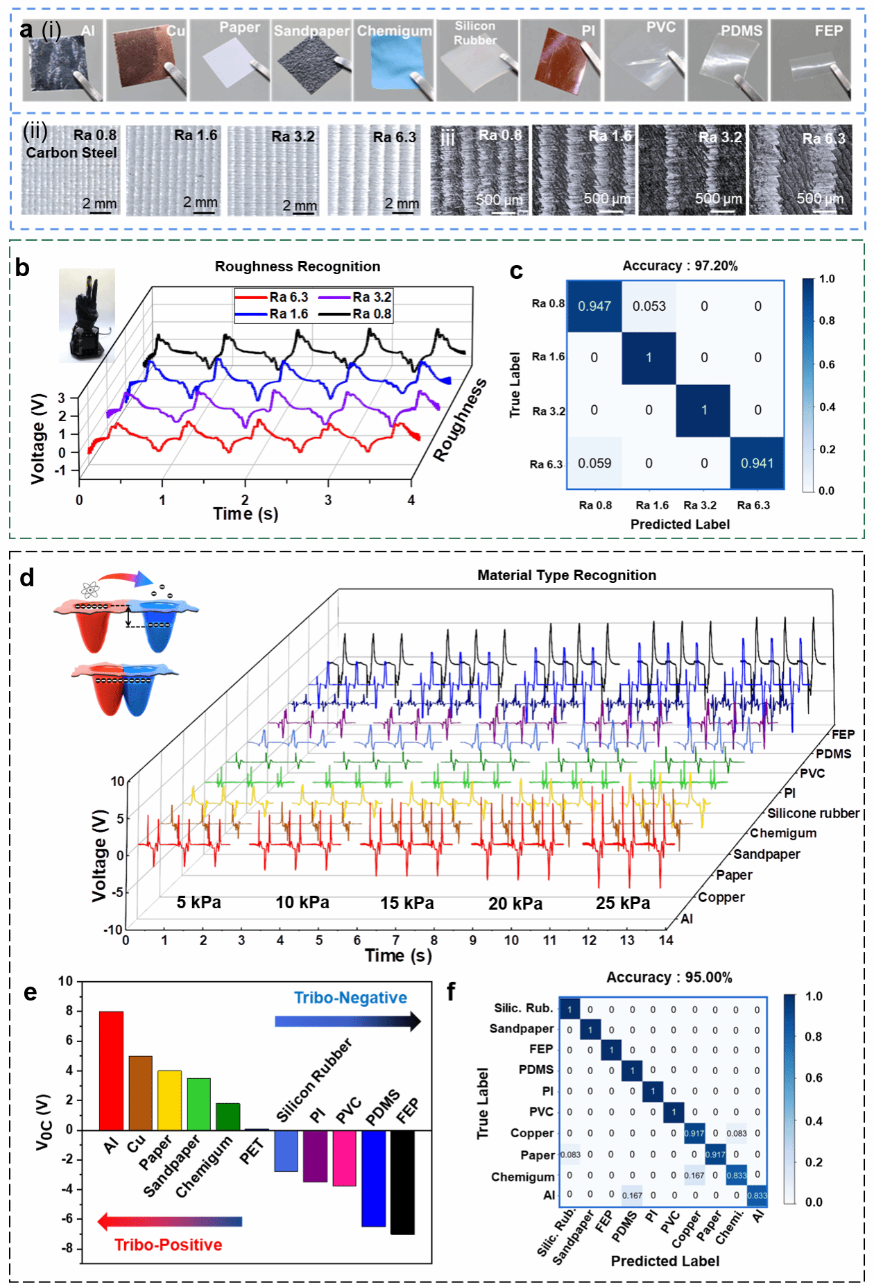 基于不同材料在接触起电过程中的得失电子能力差异这一机理,设计的电子皮肤可以准确地识别材料种类,同时借助粘滑现象实现对材料纹理/粗糙度的识别。利用深度学习技术,实现了对10种常用工程材料的准确识别(识别准确率为95.00%)以及对具有4种不同粗糙度的碳钢材料的准确识别(识别准确率为97.20%)(图4)。